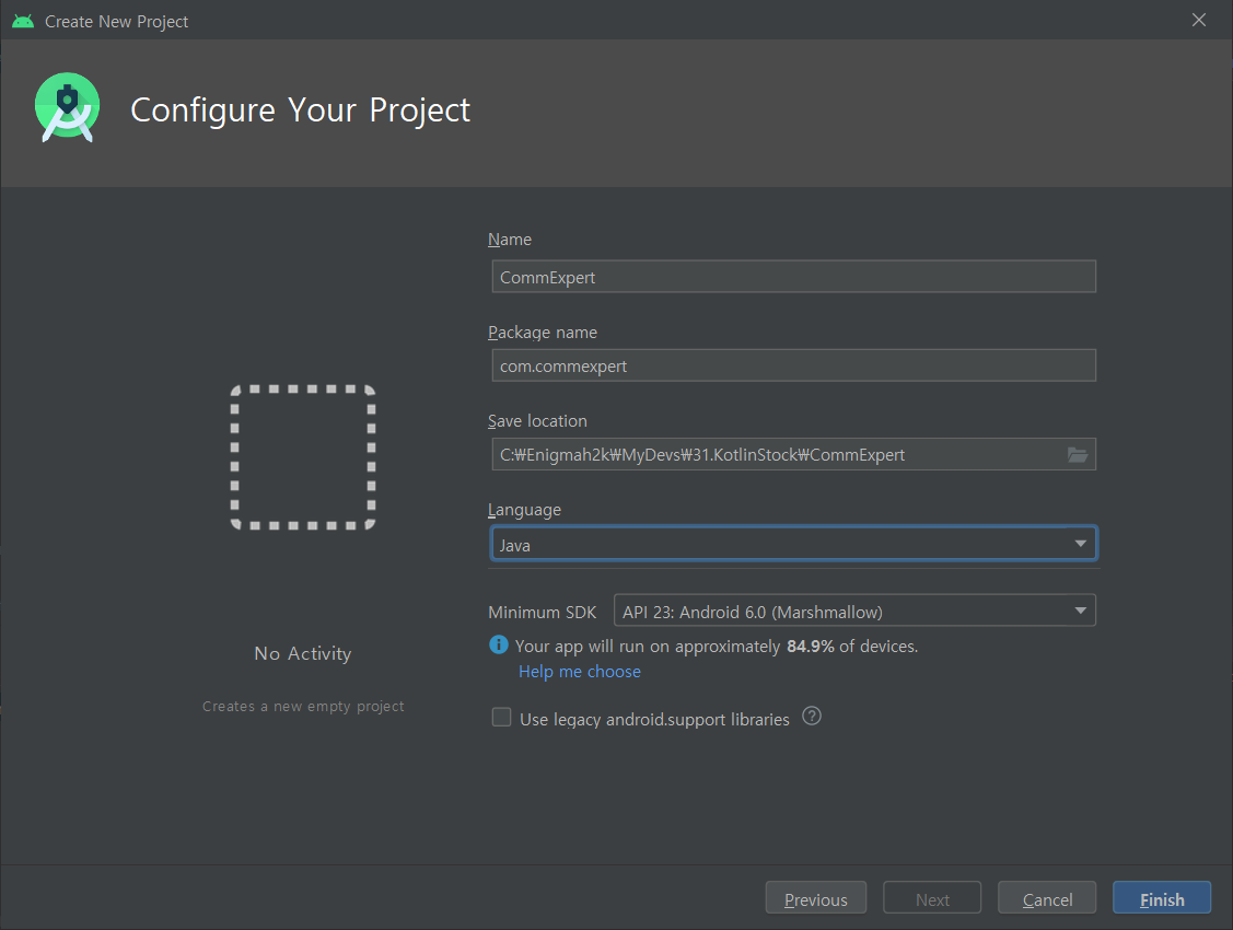 Sample은 Java로 되어 있어 Java를 선택한다. 앱 개발시에는 Kotlin으로 하겠다.