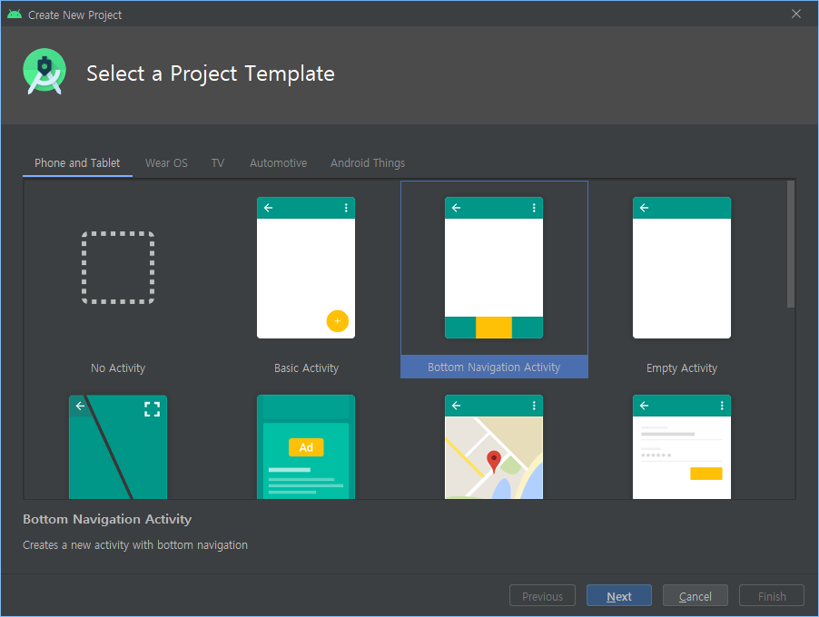 향후 기능 확장을 위해 Fragment 구조인 Bottom Navigation Activity 를 선택하여 만들겠습니다.