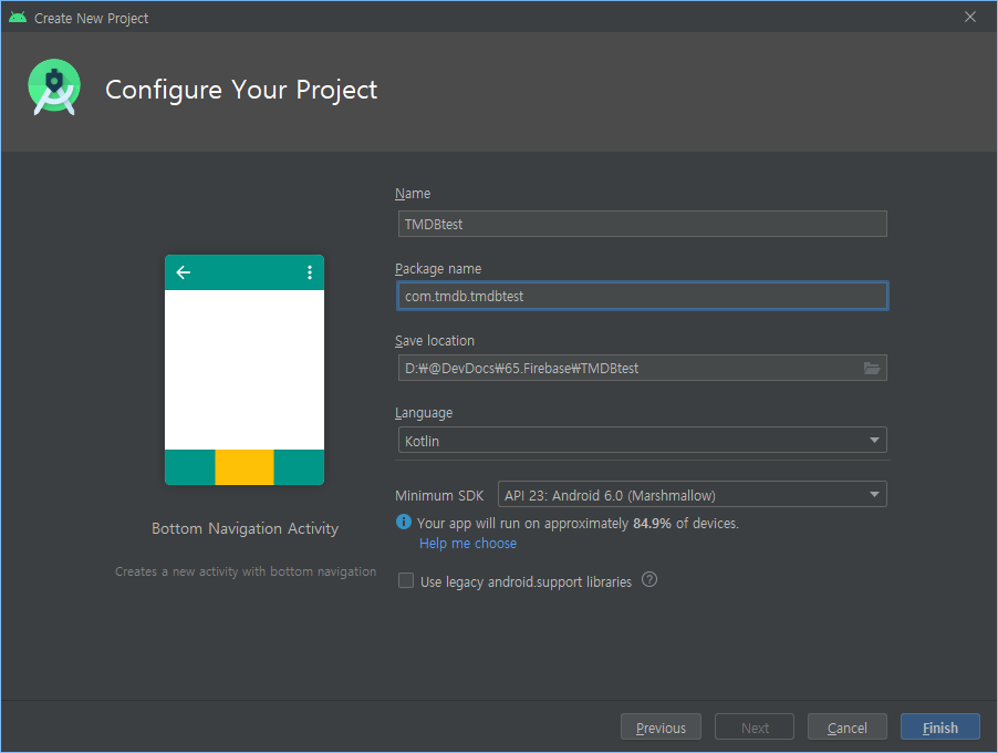 앱 이름은 TMDBtest로 하고 packasge name 은 com.tmdb.tmdbtest 로 하겠습니다.