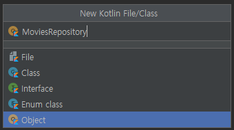 아래와 같이 Object 를 선택하고 MoviesRepository 를 입력하여 MoviesRepository.kt 파일을 생성합니다.