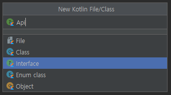 아래와 같이 Interface를 선택하고 Api를 입력하여 Api.kt 파일을 생성합니다.