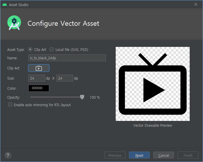 Vector Asset 도 live tv 아이콘을 선택하여, ic_tv_black_24dp 이름으로 생성합니다.