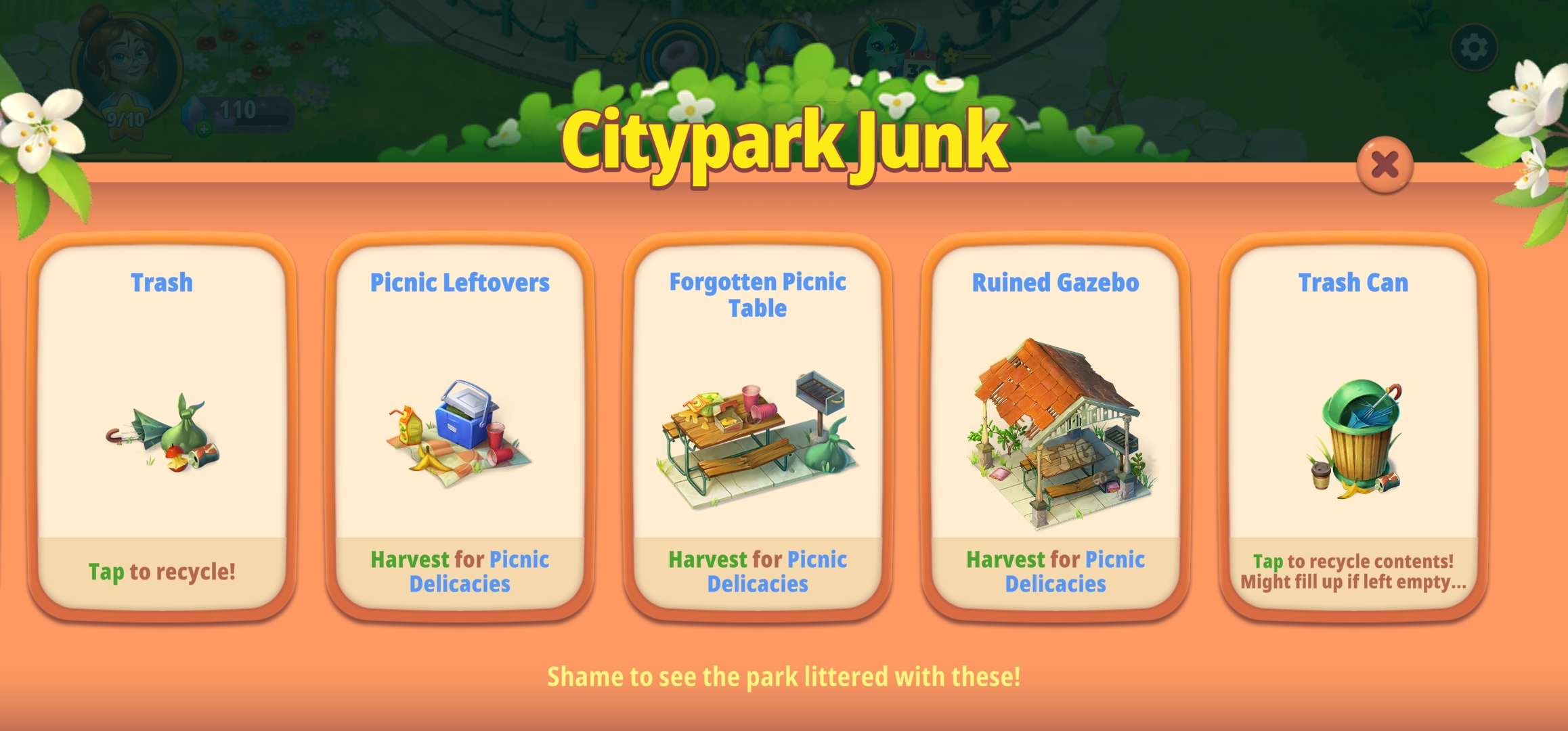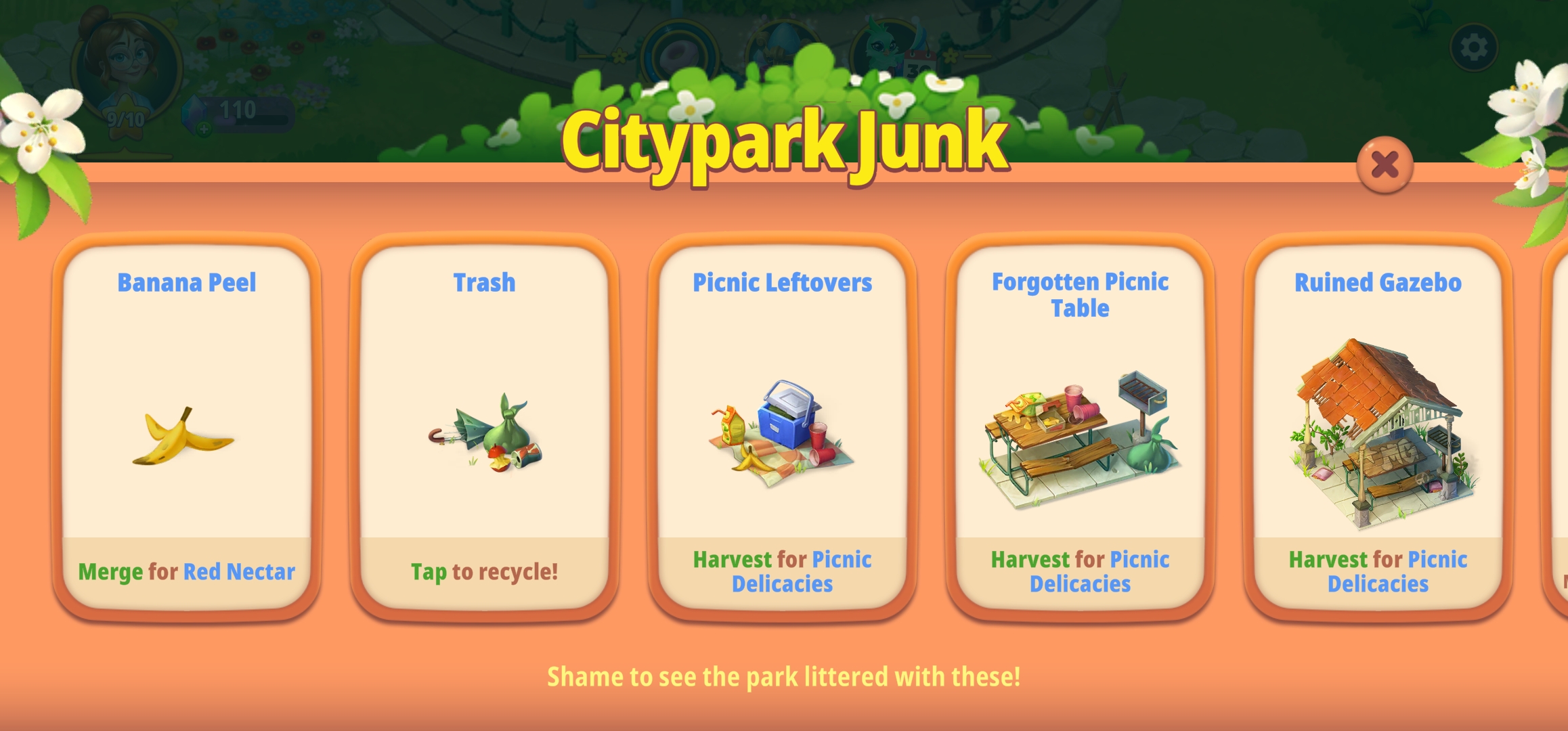 Banana Peel -> Trash -> Picnic Leftovers -> Forgotten Picnic Table -> Ruined Gazebo -> Trash Can