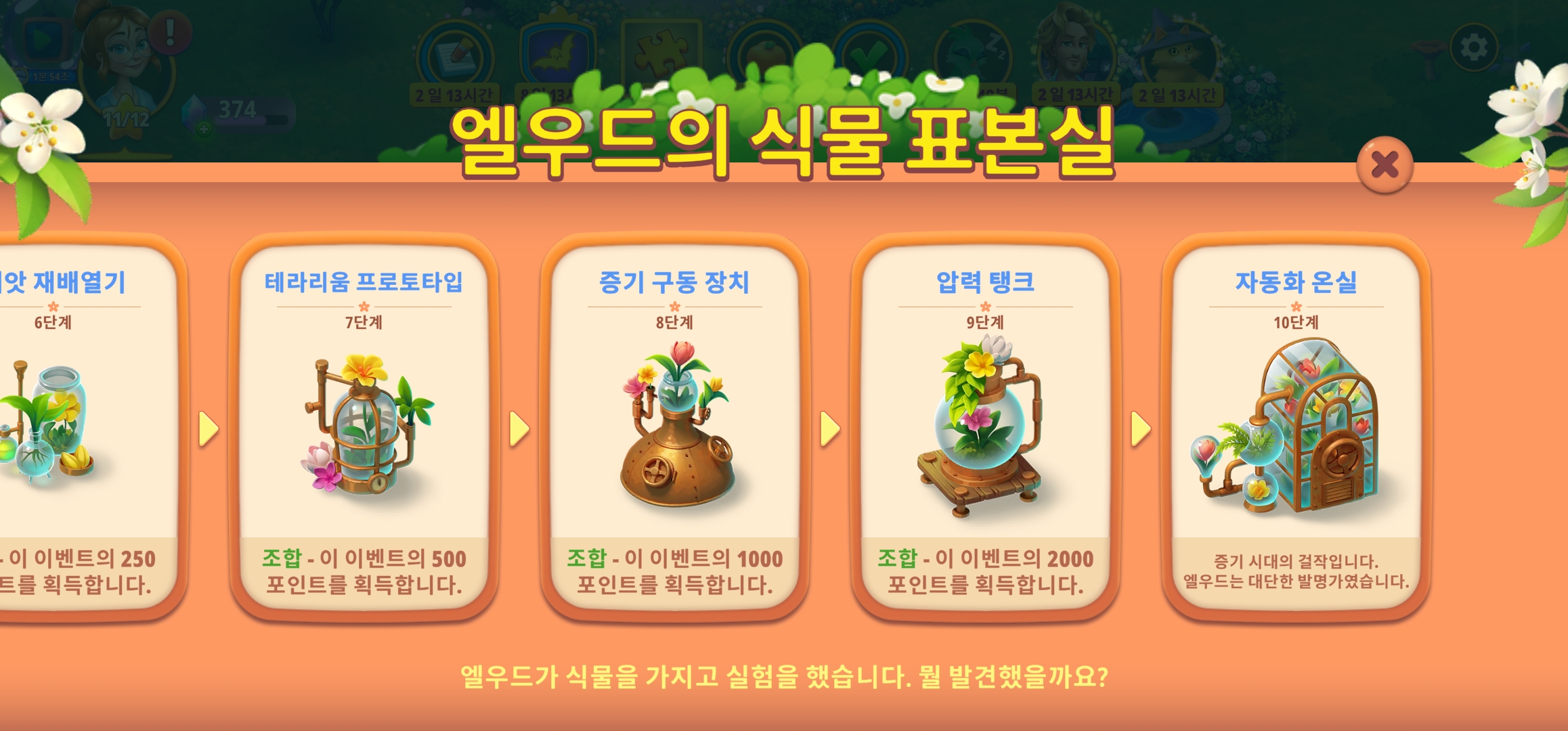 마른 씨앗 > 추출 증류기 > 식물 선반 > 꽃 추출소 > 난초 조작기 > 씨앗 재배열기 > 테라리움 프로토타입 > 증기 구동 장치 > 압력 탱크 > 자동화 온실